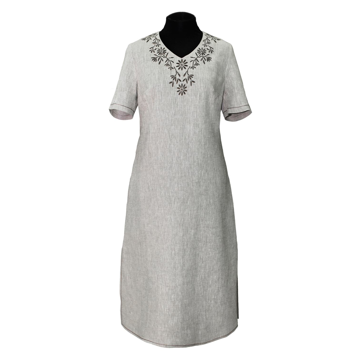 V-образный вырез платья из льна украшен красивой вышивкой цветами подснежника.