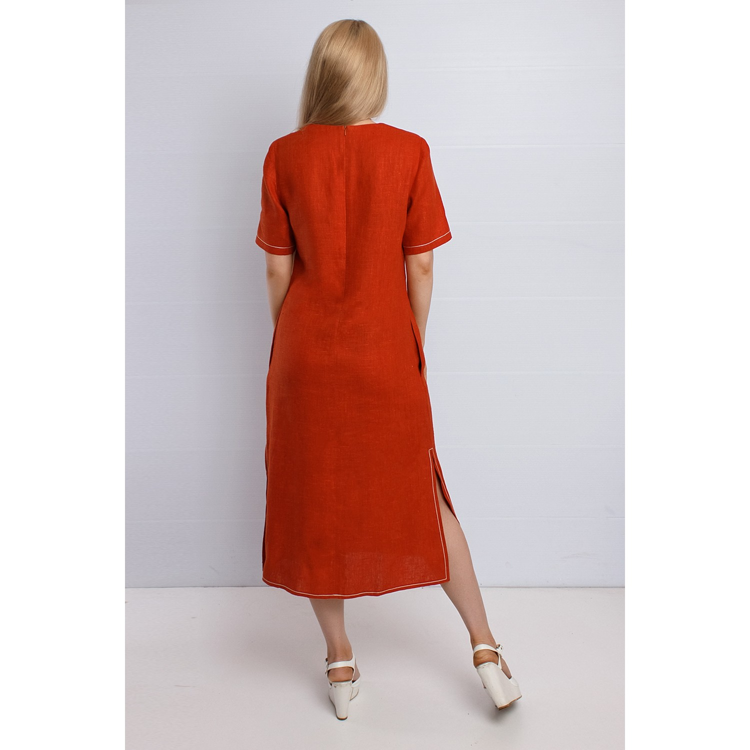 В боковых швах платья из льна расположены внутренние карманы, а ниже оформлены разрезы, которые отстрочены декоративной строчкой идущей так же по низу изделия.
